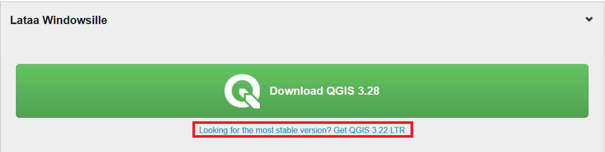 Löydät QGISin verkkosivujen etusivulta linkin, jonka avulla pääset lataamaan QGIS-työpöytäohjelmiston. Lataa sivustolta viimeisin QGIS LTR (long term release eli pitkäaikaisversio). Pitkäaikaisversio sopii parhaiten ammattikäyttöön, sillä se on vakain QGIS-versio – siitä voi kuitenkin puuttua joitakin uudempien versioiden ominaisuuksia. QGISin voi asentaa Windows-, Linux- tai Mac-käyttöjärjestelmään. Eri järjestelmien QGIS-versioiden välillä huomattavimmat erot ovat väriskeemoissa ja tiedostopoluissa – muuten erot ovat hyvin pieniä.