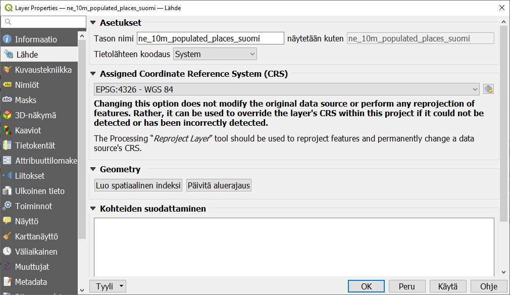 Psst! Paikkatietoaineistolla pitäisi aina olla asetettuna jokin koordinaattijärjestelmä!