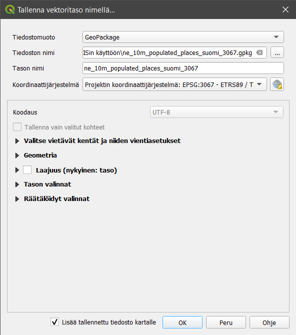 Vaihdetaan ensin tiedostomuoto Shape-tiedostostaGeoPackageen. Valitse tämän jälkeen Tiedoston nimi -kohdassa uudelleenprojisoidun aineiston sijainti ja anna sille nimeksi ne_10m_populated_places_suomi_3067. Aseta koordinaattijärjestelmäksi ETRS89/TM35FIN (EPSG: 3067) ja rastita Lisää tallennettu tiedosto kartalle. Paina sitten OK.