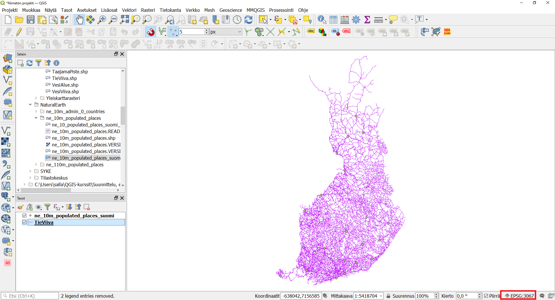 QGISin Tasot-paneeliin ilmestyy uudelleenprojisoitu paikkatietoaineisto. Voit tarkistaa koordinaattijärjestelmän tason ominaisuuksista.