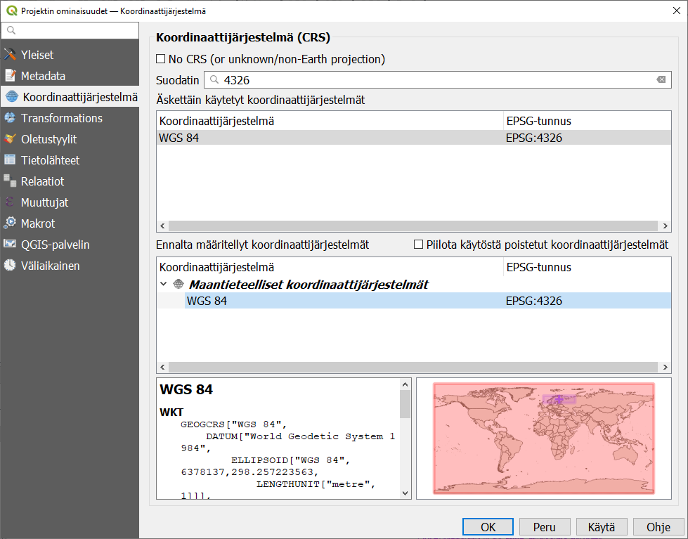 Vaihda (= uudelleenprojisoi lennossa) projektin koordinaattijärjestelmäksi WGS 84 (EPSG: 4326) ja paina OK. Löydät halutun koordinaattijärjestelmän helpoiten kirjoittamalla EPSG-koodin Suodatin-kenttään.