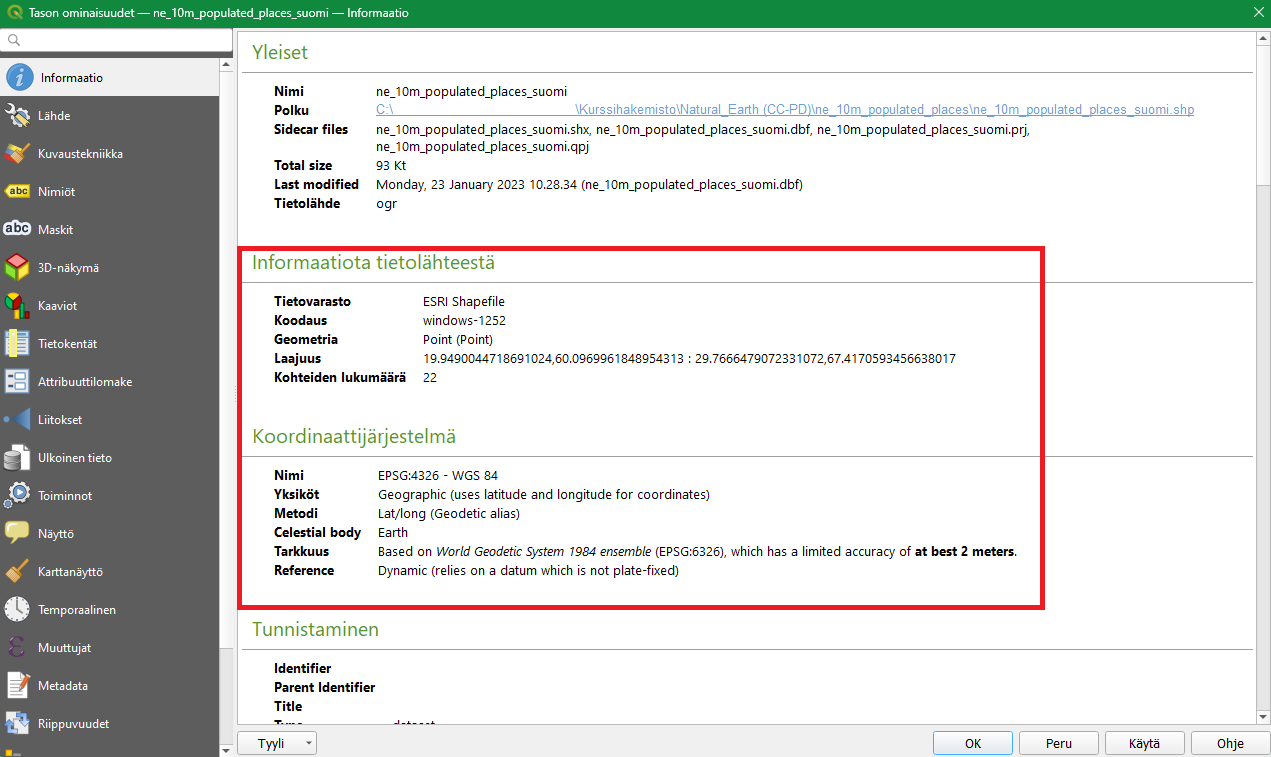 Tarkastele nyt tason ne_10m_populated_places_suomi koordinaattijärjestelmää klikkaamalla tasoa hiiren oikealla painikkeella Tasot-paneelissa ja valitsemalla Ominaisuudet…. QGISiin avautuu Tason ominaisuudet -ikkuna, josta löytyy paljon tietoa kyseisestä paikkatietoaineistosta. Informaatio-välilehdeltä löydät tietoa mm. paikkatietoaineiston koodauksesta, geometriatyypistä, koordinaattijärjestelmästä ja kohteiden lukumäärästä. Huomaa, että tämän kyseisen tason koordinaattijärjestelmä on todellisuudessa eri kuin TieViiva-aineiston tai projektin koordinaattijärjestelmä. Silti QGIS esittää aineiston karttaikkunassa ETRS89/TM35FIN-koordinaattijärjestelmässä, sillä projektin koordinaattijärjestelmä on dominoiva.