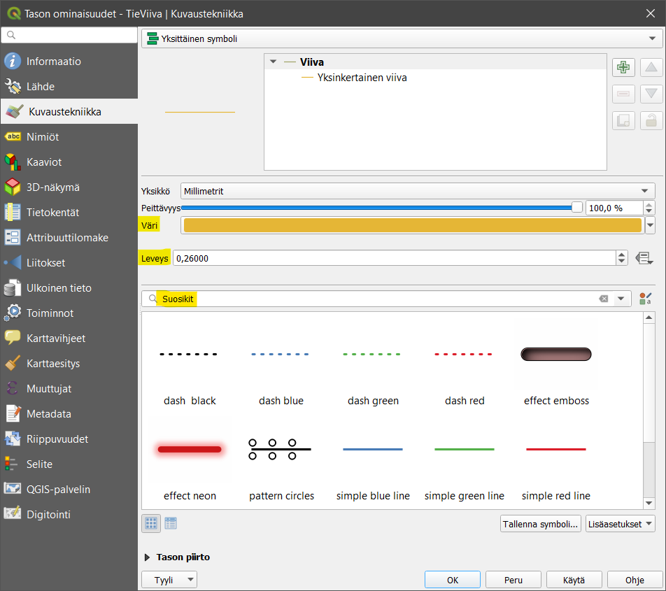 Vaihda TieViiva-aineiston Väri ja Leveys haluamaksesi ja paina lopuksi Käytä. Näin voit tarkastella tekemiäsi muutoksia sulkematta Tason ominaisuudet -ikkunaa - aivan kuten rasteriaineistossakin. Avaa vielä jokin symbolikirjasto, esimerkiksi Suosikit, ja muuta viivan tyyliksi jokin sinua miellyttävä tyyli. Paina lopuksi OK, jolloin ikkuna sulkeutuu ja TieViiva-taso näkyy nyt määrittämälläsi kuvaustekniikalla.