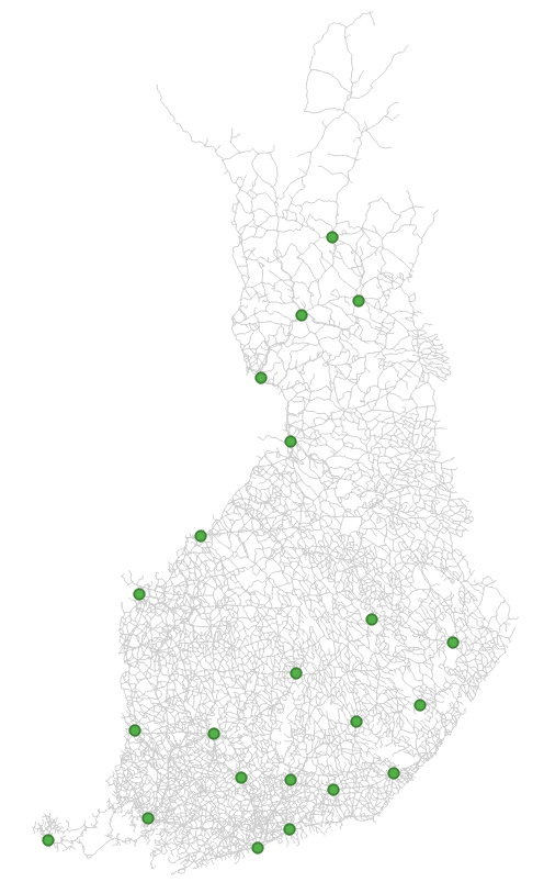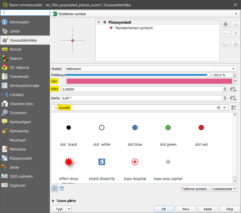 Visualisoidaan seuraavaksi piste-aineistoa. Aseta ne_10m_populated_places_suomi-aineisto näkyviin yhdessä TieViiva-aineiston kanssa ja piilota muut aineistot. Tämä aineisto sisältää Natural Earth -kaupunkiaineiston Suomesta. Avaa tason Kuvaustekniikka-välilehti samalla tavalla kuin äsken viivatason yhteydessä. Huomaa erot viiva- ja pisteaineiston ominaisuuksissa. Vaihda aineiston Väri ja Koko ja paina taas Käytä. Vaihda myös symbolia ja kokeile, miten kierto vaikuttaa symbolin näkymiseen.