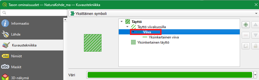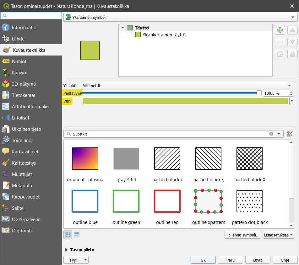Seuraavaksi muokkaamme visualisointityyliämme hieman pidemmälle. Symbologiat voivat QGISissä koostua yhdestä tai useammasta symbolitasosta (kuvassa Täyttö-kohdan alla). Esimerkiksi monikulmioiden symbolitasojen hyödyntäminen voi tuottaa hyvinkin hienovaraisen visualisoinnin. Symbolitasojen avulla voidaan määrittää monikulmion täyttämisen värit ja tyylit (esim. pistetäyttö).