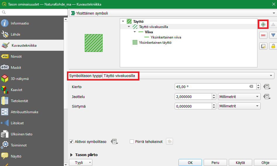 Lisää uusi symbolitaso NaturaKohde_ma-tasolle. Avaa tason Kuvaustekniikka-asetukset (Tason ominaisuudet -ikkunasta) ja lisää uusi symbolitaso painamalla plussa-kuvaketta.