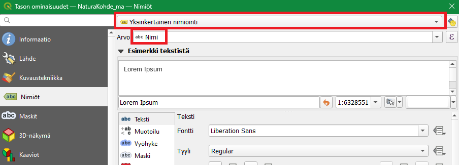 Voit myös testata tekstien edistyneitä ominaisuuksia NaturaKohde_ma -tasolla. Voit ohjata nimiöiden tekstejä lausekepohjaisesti QGISin Lausekkeen muokkaus -työkalulla. Saat lausekkeen muodostajan auki Nimiöiden perustana -alasvetolaatikon vieressä olevasta painikkeesta: