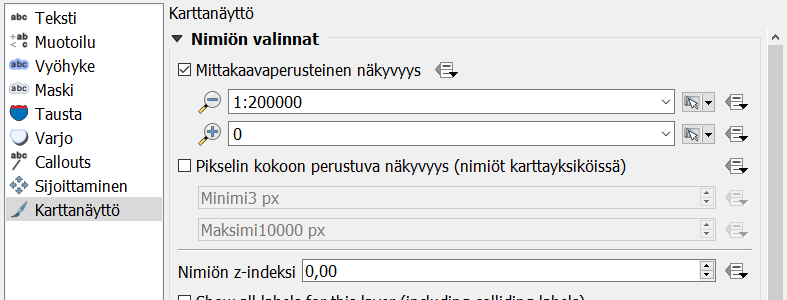 Psst! Yksi hyödyllinen tapa rajata nimiöitä on Piirtäminen > Kohteen valinnat ja asettaa kohtaan Häivytä nimiöinti kohteilta, jotka ovat pienempiä kuin-kohtaan jokin arvo. Näin QGIS näyttää vain isoimpien kohteiden nimiöinnit.