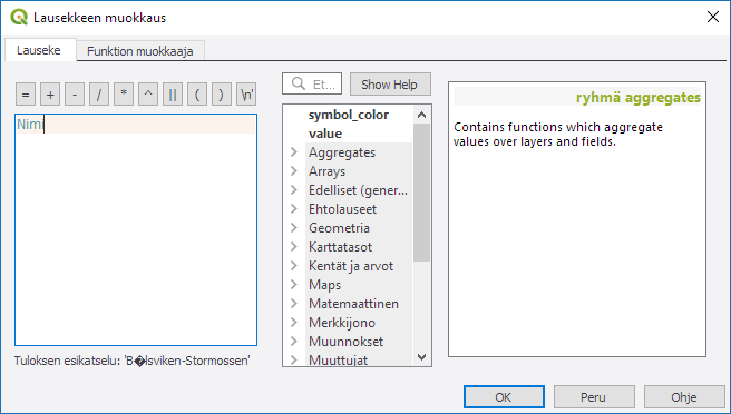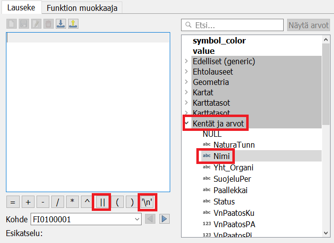 Psst! Voit lisätä rivinvaihtosymbolin lausekkeeseen painamalla Lauseke-ikkunan päällä olevaa painiketta. Samalla tavalla voit lisätä aineistossa olevia kenttiä lausekkeeseen laajentamalla kentät ja arvot -valikon ja kaksoisklikkaamalla kentän nimeä.