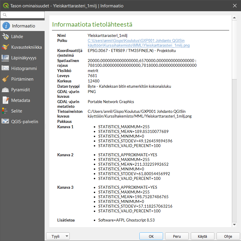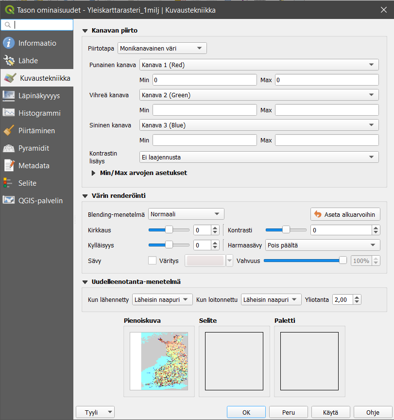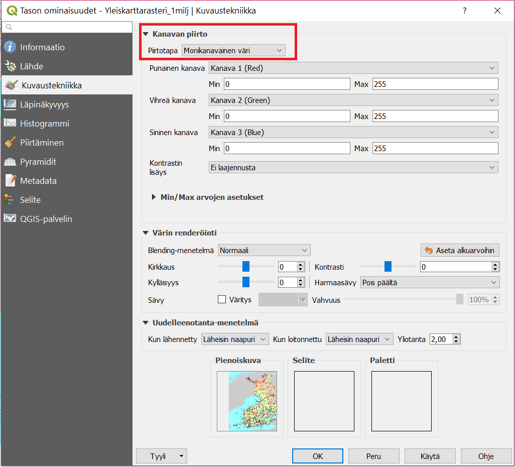Kanavan piirto sisältää erilaisia rasteriaineistojen visualisointikeinoja, esimerkiksi Monikanavainen väri -visualisointitavassa käytetään kolmea eri näkyvän valon kanavaa (R = red, G = green, B = blue eli RGB) rasterikuvan visualisoimiseen. Väriarvoja muokkaamalla voidaan muokata tapaa, jolla rasterikuvan pikselit näkyvät kartalla. Käyttämämme rasteriaineiston (yleiskarttarasteri) visualisointi on asetettu siten, että se näyttää parhaimmalta, jos kanavat asetetaan seuraavalla tavalla: