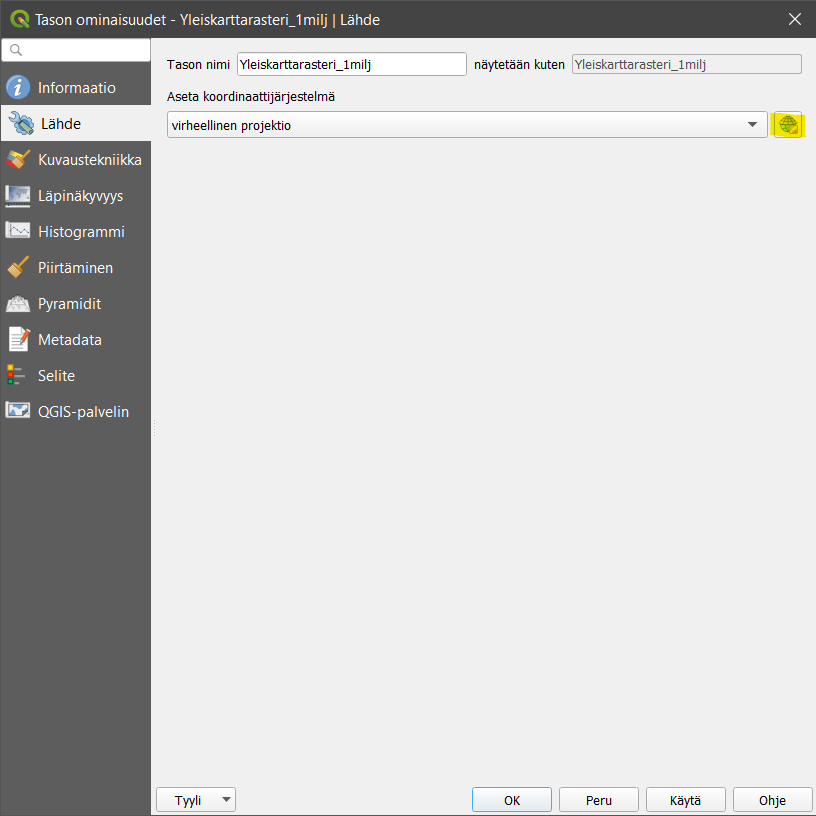 Valitse ikkunasta Lähde-välilehti, josta löydät tiedot aineiston koordinaattijärjestelmästä. Voit huomata, että Aseta koordinaattijärjestelmä -alasvetovalikon kohdalla lukee virheellinen projektio. Klikkaa vieressä olevaa Valitse koordinaattijärjestelmä -painiketta ja aseta tason koordinaattijärjestelmäksi ETRS89/TM35FIN (EPSG:3067). Paina lopuksi OK ja OK. Aineisto on nyt projisoitu valittuun koordinaattijärjestelmään.