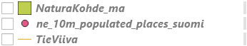 Siirrytään nyt visualisoimaan vektoriaineistoja. Tarkastele kaikkia QGIS-projektiin avaamiasi vektoriaineistoja. Voit huomata, että jokaisen tason vasemmalla puolella on muoto, joka kuvastaa kyseisen tason vektorityyppiä. TieViiva on viiva-aineisto, ne_10m_populated_places_suomi on pisteaineisto ja NaturaKohde_ma on polygoniaineisto.