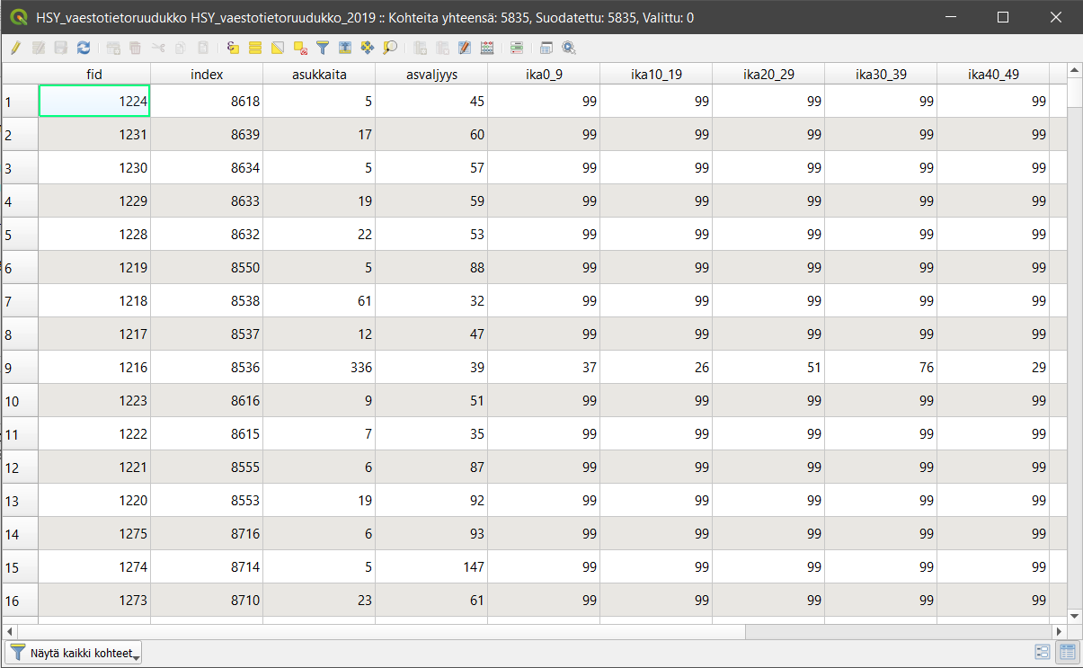 Attribuuttitauluissa sarakkeiden nimet ovat usein lyhennetyssä muodossa, minkä vuoksi sarakkeiden merkitystä on tyypillisesti vaikea päätellä lyhenteistä. HSY_vaestotietoruudukko-aineistossa silmiinpistävää on myös se, että taulukossa toistuu luku 99 useaan otteeseen. Metatietojen avulla voimme kuitenkin selvittää muun muassa sen, miten asukkaita-sarakkeen tiedot on laskettu sekä millä tavalla tiedot on poistettu ruuduissa, joissa asuu 0-4 asukasta. Ika-sarakkeet sisältävät asukkaiden määrät ikäluokittain, mutta niille on annettu arvo 99 aina kun ruudukon asukasmäärä on ollut alle 100. Tarkastele aineistoa myös kartalla. Huomaatko yhden ruudun, joka näyttää sijaitsevan kaukana kaakossa keskellä merta?