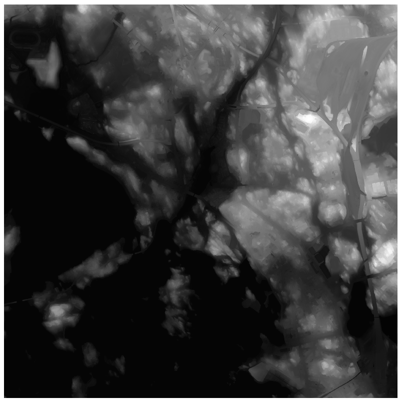 Aseta nyt L4133B-rasteriaineisto näkyväksi ja piilota muut aineistot. L4133B.asc on Maanmittauslaitoksen avoin korkeusmalliaineisto, joka sisältää osan Helsingistä. Jos aineisto avautuu tuntemattomassa koordinaattijärjestelmässä (= virheellisessä projektiossa), aseta tasolle koordinaattijärjestelmäksi ETRS89/TM35FIN (EPSG:3067). Muista tarkistaa myös projektin koordinaattijärjestelmä. Oletuksena korkeusmalli näyttää tällaiselta: