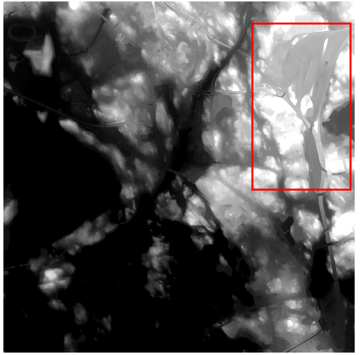 Huomaa, että QGIS on tunnistanut, että aineisto sisältää jatkuvia arvoja ja on visualisoinut ne yksittäisenä harmaana kanavana. Oletusvärityksellä onnistut erottamaan Pasilan ratapihan oikeassa yläkulmassa.