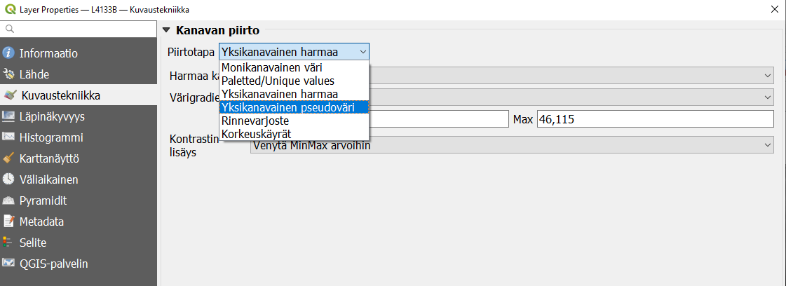 Luokittele aineisto uudelleen niin, että Pasilasta erottuu tarkempia yksityiskohtia. Aseta mittakaavaksi 1:5000 (QGIS-työtilan alapalkista) ja vieritä karttaa tasaisen sävyisenä näkyvään ratapihan alueeseen. Klikkaa auki Min/Max arvojen asetukset ja muokkaa asetuksia niin, että kuva käyttää Min/Max-arvoja ja Tilastojen laajuus -arvoksi on määritelty Nykyinen karttaikkuna. Katso mallia kuvasta: