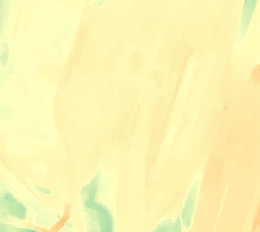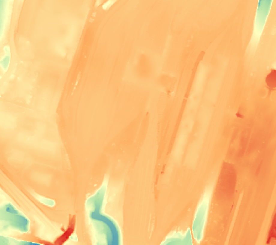 Vasemmanpuoleisessa kuvassa on ratapihan alue pseudoväreillä esitettynä. Oikeanpuoleisessa kuvassa on sama alue sen jälkeen, kun väriliukuma on luokiteltu uudelleen näkyvän karttaikkunan alueen Min/Max-arvojen mukaisesti. Voit myös testata Tila-kohdasta eri jaottelumuotoja. Kvanttiili-valinnassa muodot näkyvät yksivärisenäkin vielä voimakkaammin.