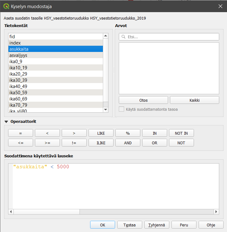 Irralliseen ruutuun on tässä aineistossa sijoitettu kaikki ne pk-seudun asukkaat, joilla ei ole vakituista kotiosoitetta. Näytä kohteen tiedot -työkalulla nähdään, että tämän ruudun asukasmäärä on kymmenkertaisesti suurempi kuin minkään muun aineiston ruudun. Se siis vääristää luokittelua ja aineistosta laskettuja tilastoja (mm. keskimääräinen asukastiheys ruutua kohti). Suodatetaan tämä ruutu pois aineistosta: klikkaa tason nimeä hiiren oikealla ja valitse Suodata… Kirjoita (tai valitse tietokentistä ja operaattoreista klikkaamalla) suodatuslausekkeeksi “asukkaita” < 5000. Voit testata suodatuksen toimivuutta klikkaamalla Testaa.