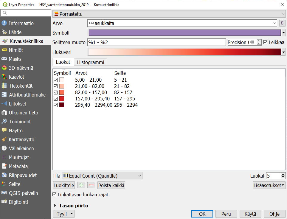 Avaa Tason ominaisuudet ja valitse tason kuvaustekniikaksi Porrastettu. Valitse seuraavasta pudotusvalikosta, minkä kentän arvoihin luokittelusi perustuu (tässä ‘asukkaita’). Aseta vielä oheisen kuvan mukaiset Arvo-, Liukuväri-, Tila- ja Luokat-määrittelyt.