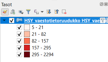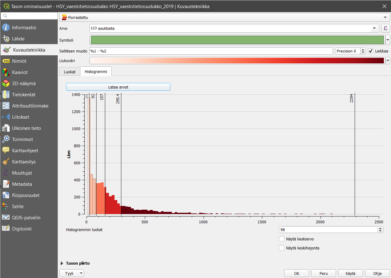 Jos Tasot-paneelissasi ei näy selitettä, paina tason nimen vasemmalla olevaa pientä nuolta ja selitteet avautuvat tason alle kuvan mukaisesti. Palaa vielä Kuvaustekniikka-asetuksiin ja kokeile Tila > Tasaväli. Paina uudelleen Luokittele jos arvot eivät päivity. Kokeile myös vaihtaa luokkien lukumäärää, luokitustapoja ja värityksiä, kunnes löydät mielestäsi sopivan tuloksen. Voit vertailla eri luokittelumenetelmiä ja tutkia aineiston jakaumaa histogrammin avulla. Histogrammi löytyy omalta välilehdeltään. Paina Lataa arvot saadaksesi histogrammin ja luokkien rajat näkyviin.