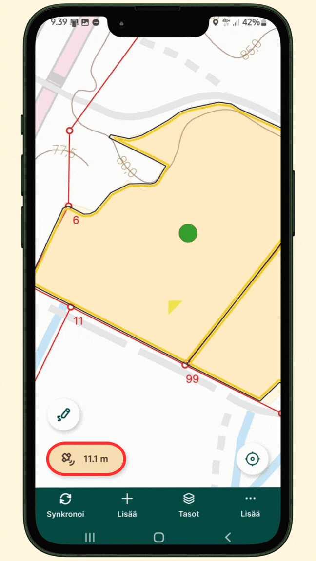 Mergin Maps -sovellus näyttää reaaliaikaisen GPS-tarkkuuden, joka vaikuttaa suoraan kenttätyön paikkatietojen laatuun. Tarkkuus näkyy kartan alareunassa ja siihen liittyy värikoodattu ympyrä, joka havainnollistaa sijainnin arvioitua virhemarginaalia.